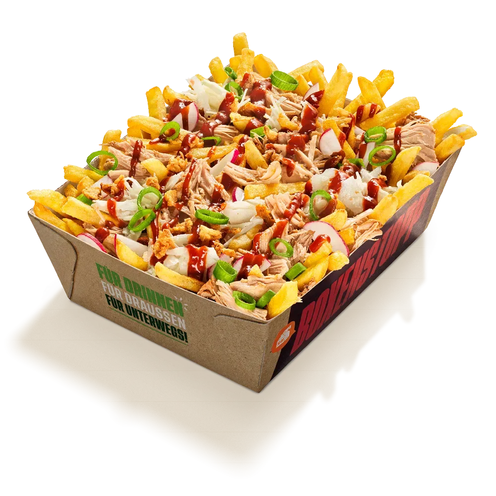 mit knusprigen Pommes frites, Truthahnfleisch in pikantem Barbecue-Dip, Coleslaw Krautsalat, Radieschen, Röstzwiebeln und frischen Frühlingszwiebeln